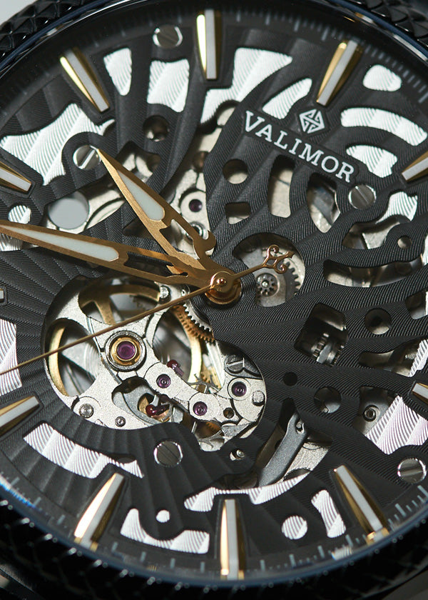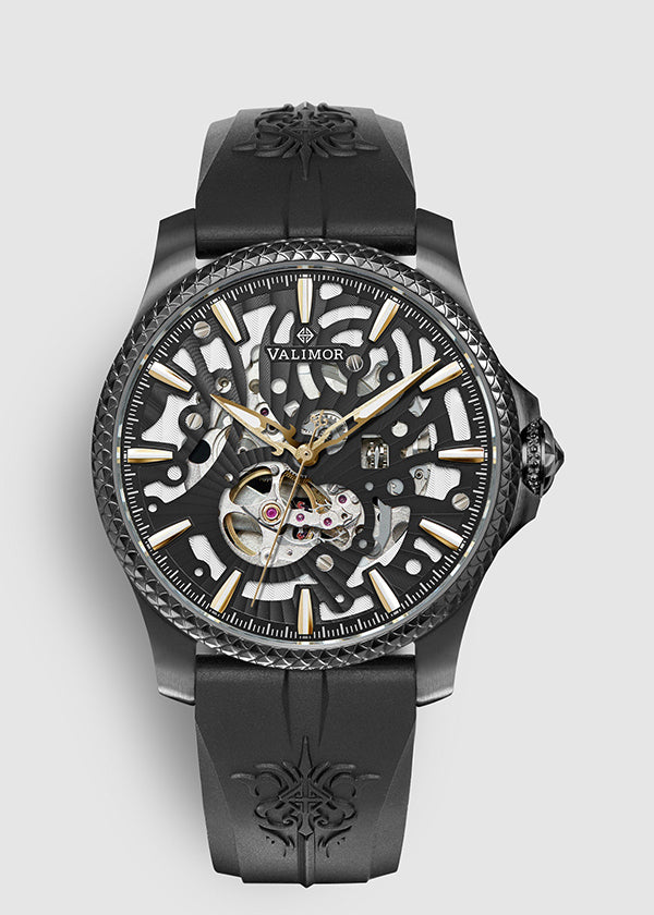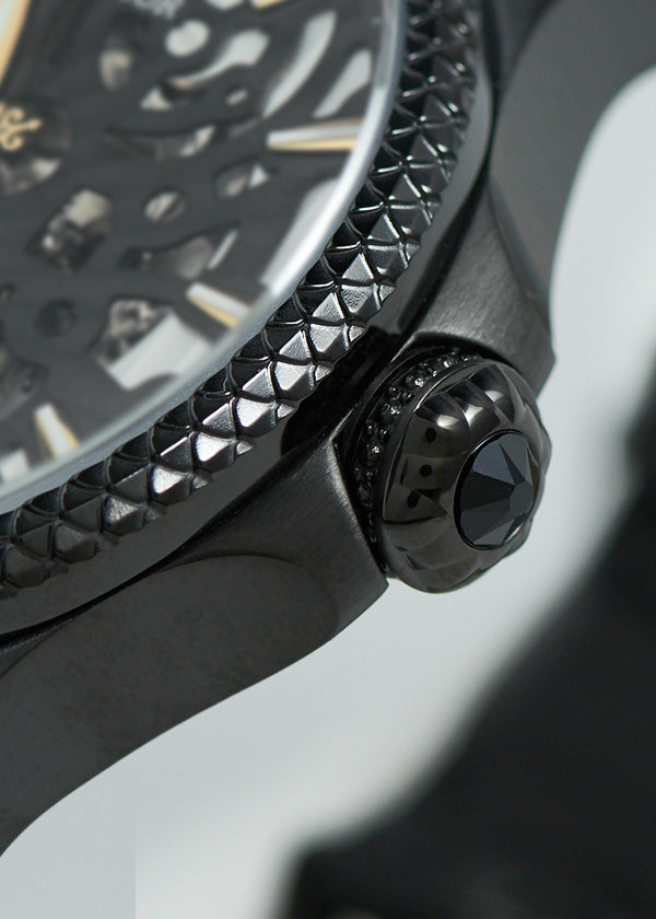 繊細なドラゴンのデザインを彫刻を施したステンレススチール「316L」。ステンレススチールは耐食性に優れ、錆びにくいです。医療用器具などに多く採用されており、肌が敏感な方でも気にせず着用できます。2018年、私たちのデザインは、ヨーロッパの28の加盟国で意匠を取得しました。EUIPO意匠特許第004742294-0001号)。新設計のリューズは、耐水性能を維持しつつ、人間工学に基づいたスムーズな操作性を向上させるための形状になっています。