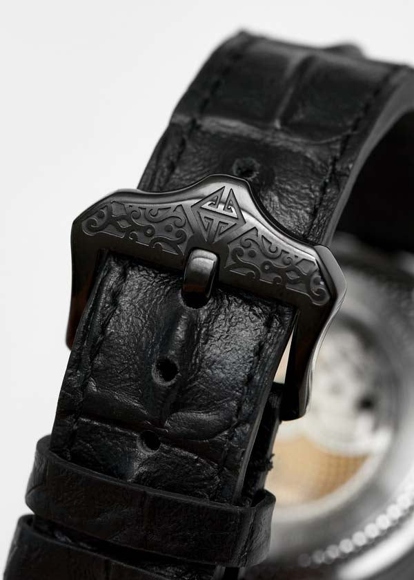 龍の尻尾をイメージしたオリジナルのストラップデザインです。素材は牛革の本革、トップグレインレザー。耐久性があり、ソフトで高品質な肌感です。すべてのストラップには、剣の柄に影響されたオリジナルのバックルが付いています。