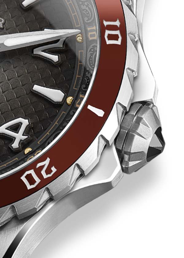 また、夜光塗料を塗布した針と組み合わせることで、昼夜を問わず幻想的な雰囲気を醸し出しています。ダークな文字盤には、ドラゴンのウロコのエングレービングが施され、デザインに深みと奥行きを与えています。