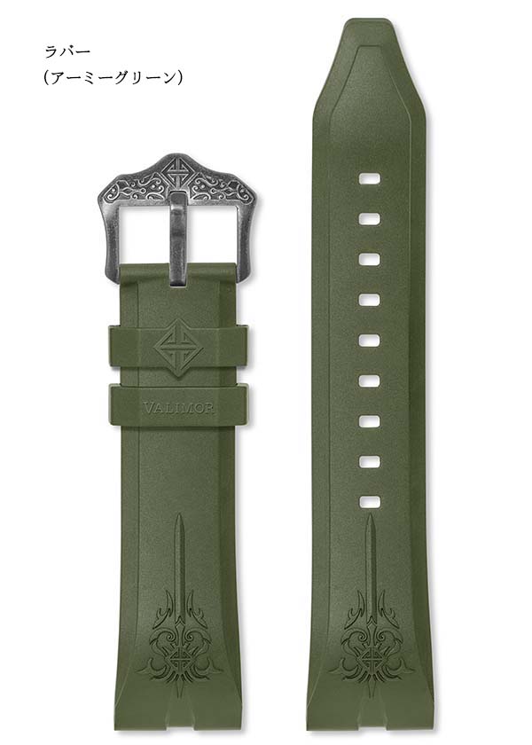 日本製のNBRゴムは、天然ゴムに比べ強度に優れ、皮脂や酸に強いのが特徴です。また、RoHS指令に適合しており、アレルギーが起きにくい素材です。ストラップには、剣の柄をイメージしたステンレスのバックルが付いており、簡単にかつ確実に装着できる構造になっています。