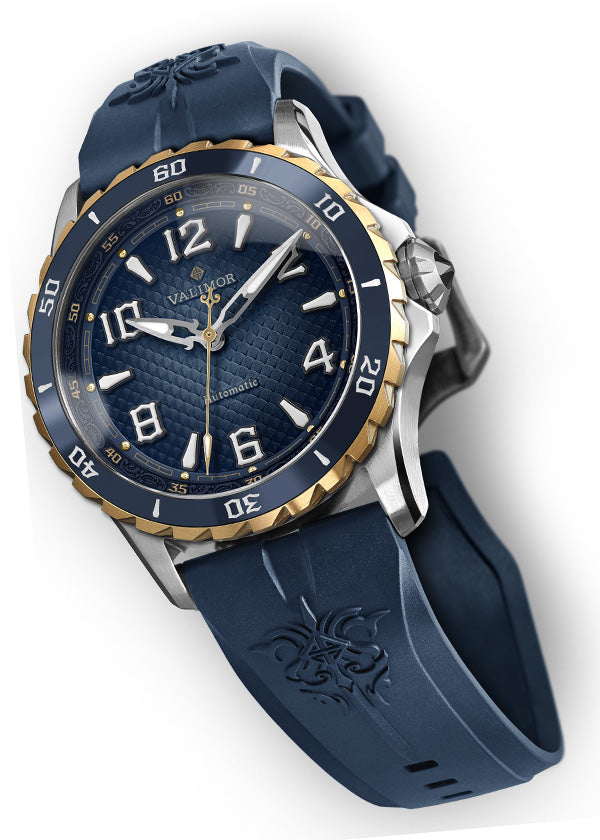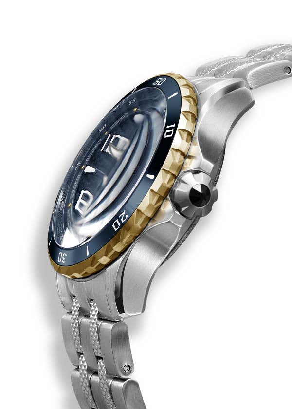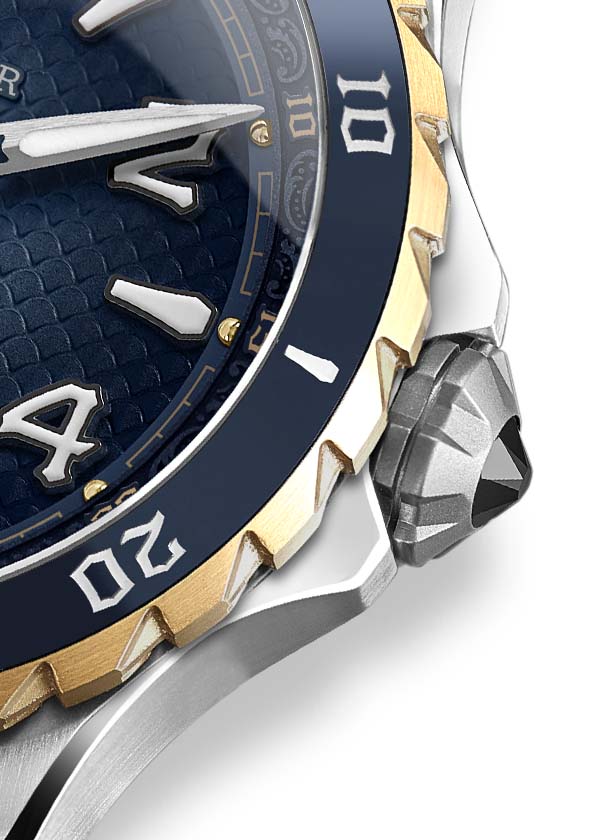 時計のケースとリューズは、宝石をちりばめた伝説の剣の柄にインスパイアされています。一方、ベゼルはキルガーラの竜骨を幾何学的なデザインでシンプルに表現しています。また、時刻とベゼルの両方を調整できるように、人間工学に基づいたデザインになっています。このデザインは、2022年1月にEUIPO Design Patentを取得しています。(EUIPO Design Patent #008778161-0001)。
