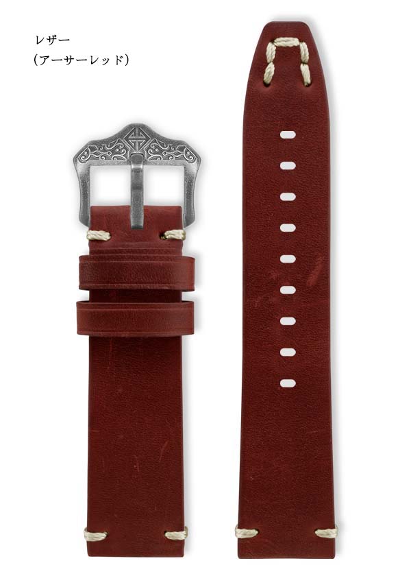 日本製のNBRゴムは、天然ゴムに比べ強度に優れ、皮脂や酸に強いのが特徴です。また、RoHS指令に適合しており、アレルギーが起きにくい素材です。ストラップには、剣の柄をイメージしたステンレスのバックルが付いており、簡単にかつ確実に装着できる構造になっています。