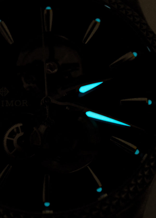 剣をイメージして作られた針。針は高精度のダイヤモンドカットを使用しています。力強さを持たせるよう太く針が作られており、時間を読みやすいです。また針や文字盤に蓄光塗装をしており、暗闇の中で光ります。