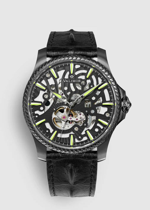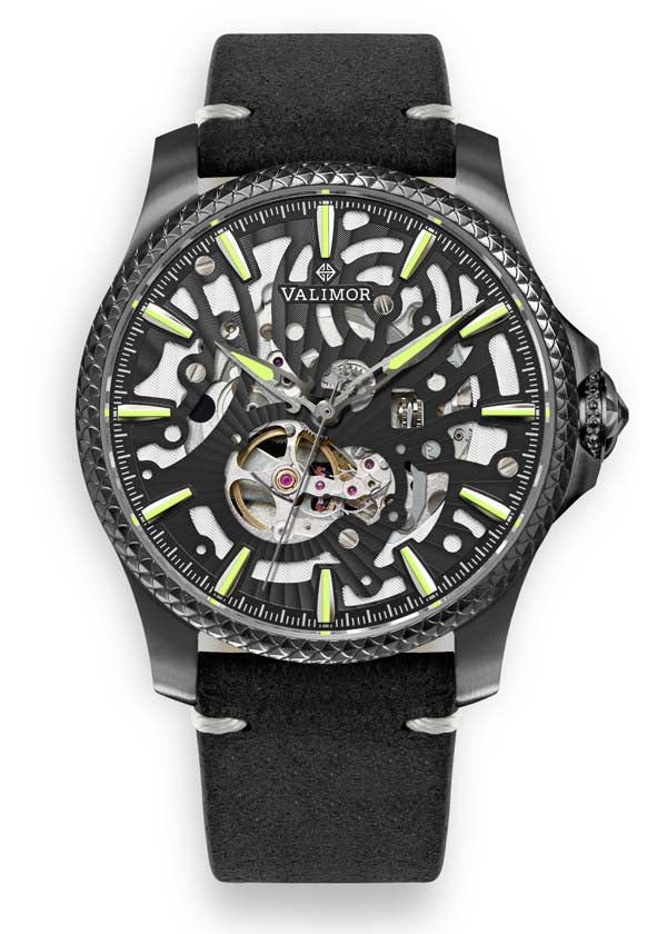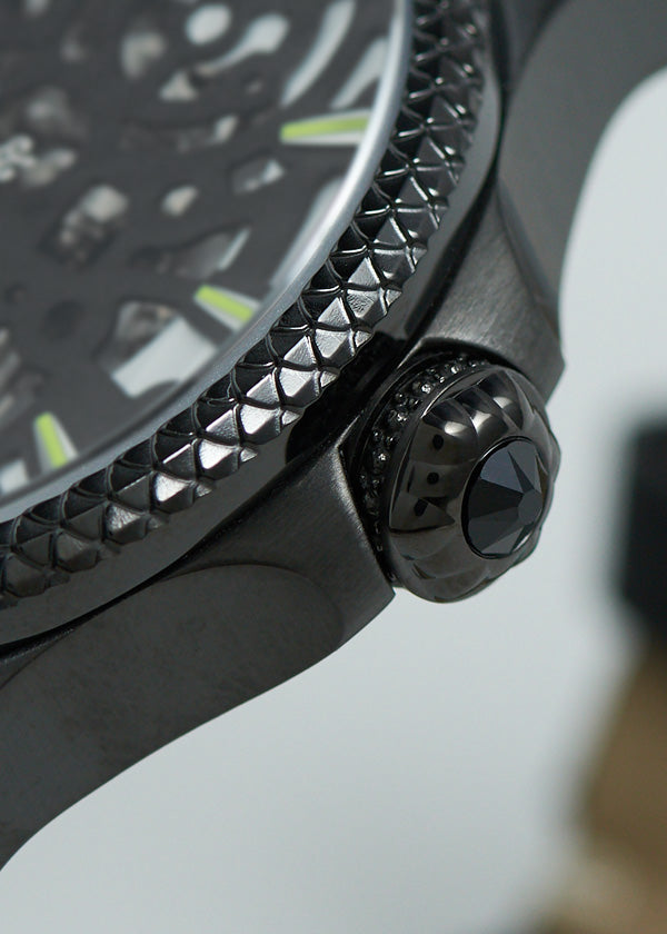 デザインは、伝説的なアーサー王の王冠を想像させる為、最高級の輝きを誇るスワロフスキークリスタル(ブラック)をリューズに使っています。
