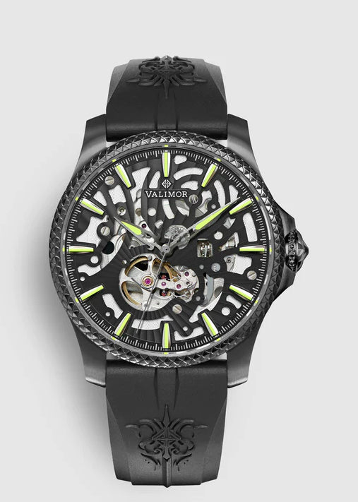 繊細なドラゴンのデザインを彫刻を施したステンレススチール「316L」。ステンレススチールは耐食性に優れ、錆びにくいです。医療用器具などに多く採用されており、肌が敏感な方でも気にせず着用できます。2018年、私たちのデザインは、ヨーロッパの28の加盟国で意匠を取得しました。EUIPO意匠特許第004742294-0001号)。新設計のリューズは、耐水性能を維持しつつ、人間工学に基づいたスムーズな操作性を向上させるための形状になっています。